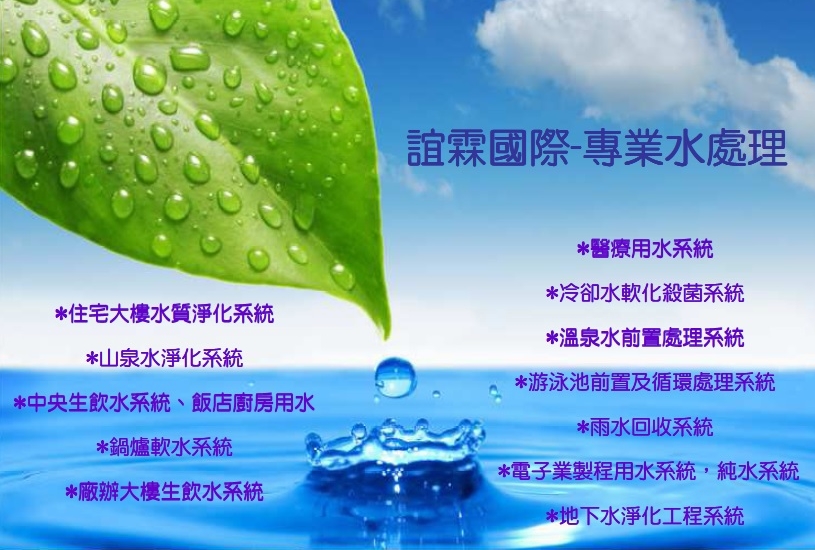 誼霖國際自成立以來,為滿足國人及水處理界對高品質淨水產品的需求,提供最專業溫馨的全方位水處理服務,包括整棟式淨水設備之銷售、設計規劃、安裝等各項服務,不再只是喝的水,而包含您的沐浴/美容/生活用水都處理的全棟淨水設備!從住宅的居家用水、工業領域、商業到其他有需求的場所皆提供熱忱專業的服務與技術。