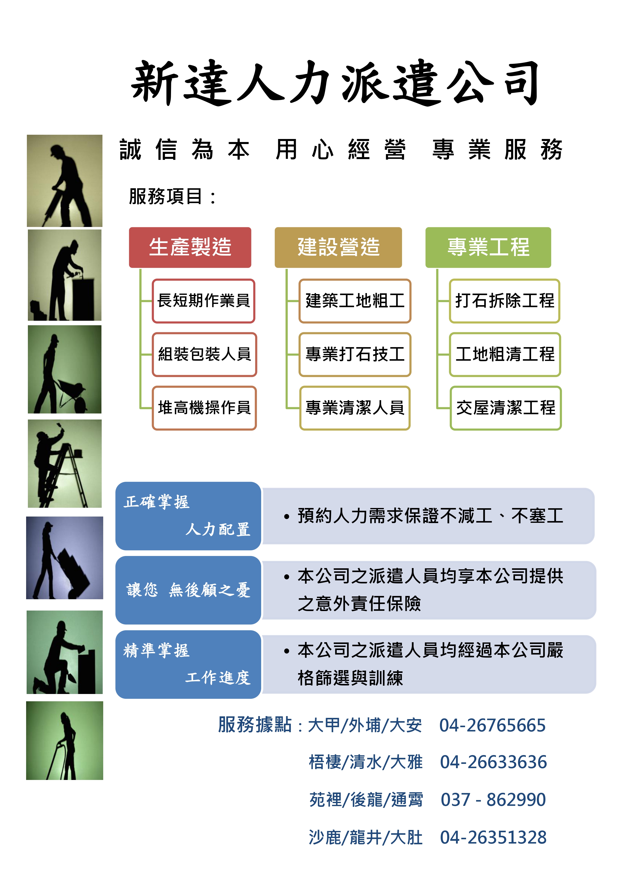 人力派遣服務項目:長短期人力需求、工廠作業員、堆高機人員、派遣契約工、各類生產外包、人力外包、人力資源、技術工、建築粗工、打石技工、臨時工、搬運工、清潔工、工地通管人員、施工電梯操作員、碼頭作業人員、舉牌傳單員、植筋工程、粗清工程、打石工程、拆除工程、保護板工程、交屋清潔、外牆清潔、地板清潔、筏基坑清潔、裝潢後細清、各項工程專業統包施作及估價之相關服務。